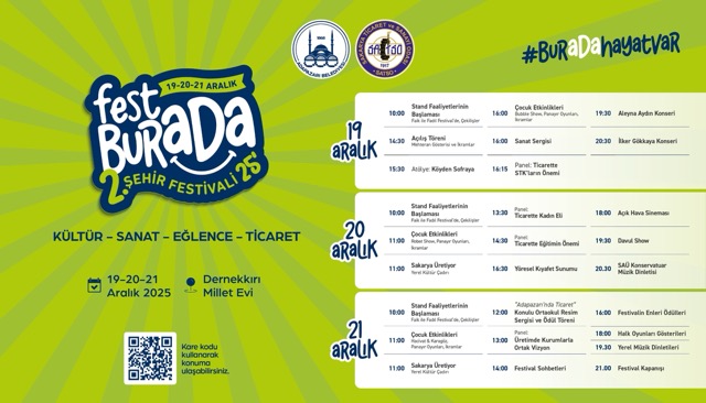 Adapazarı Belediyesi ve Sakarya Ticaret ve Sanayi Odası iş birliğiyle düzenlenen “FestBurada 2025 Kış Festivali”, 19-21 Aralık tarihleri arasında Dernekkırı Millet Evi’nde gerçekleştirilecek. Festival, şehirde kültür, sanat, eğlence ve ticareti bir araya getiren kapsamlı bir etkinlik olarak öne çıkıyor.